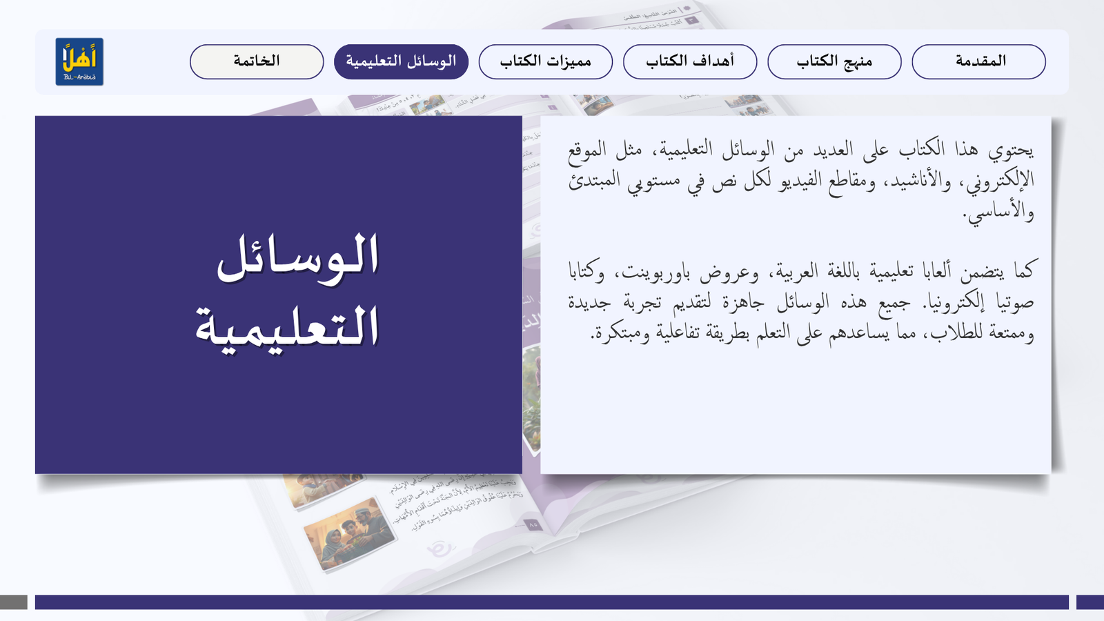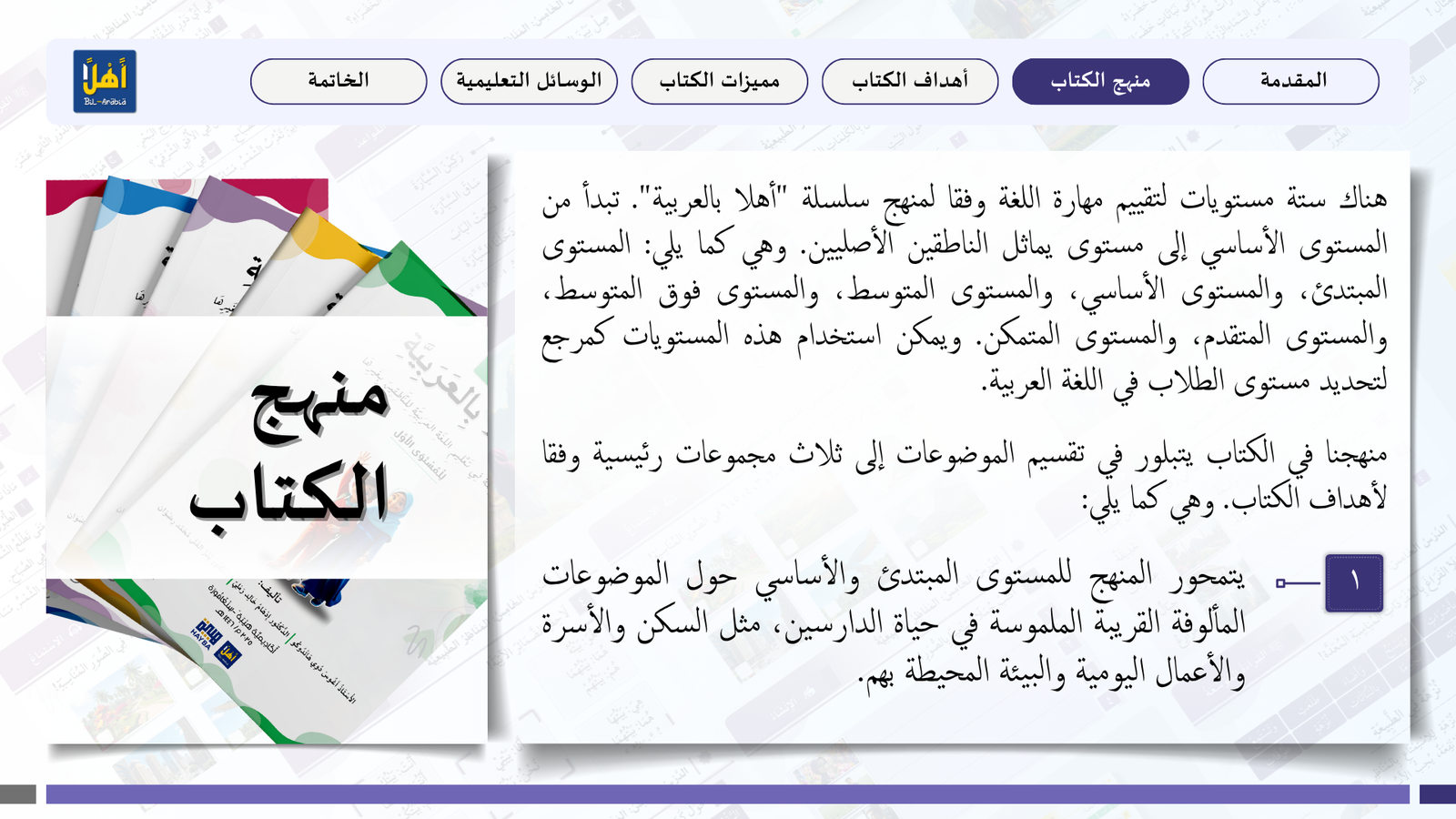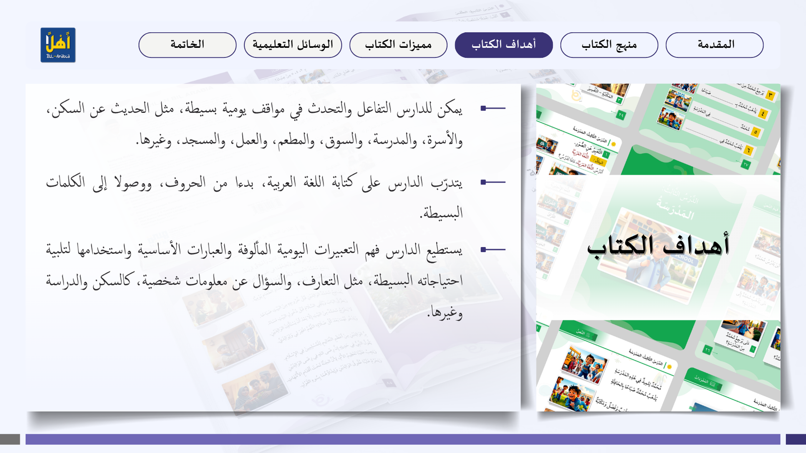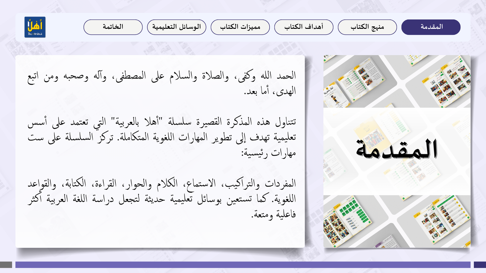 التعريف بمنهج سلسلة ” أهلا بالعربية”، وأهدافا، ومميزاتها، ووسائلها التعليمية مفصلا