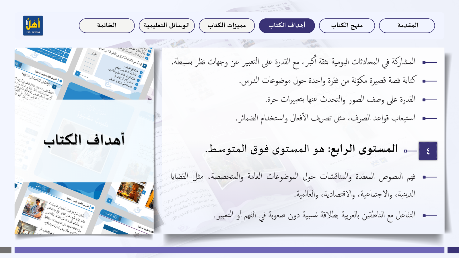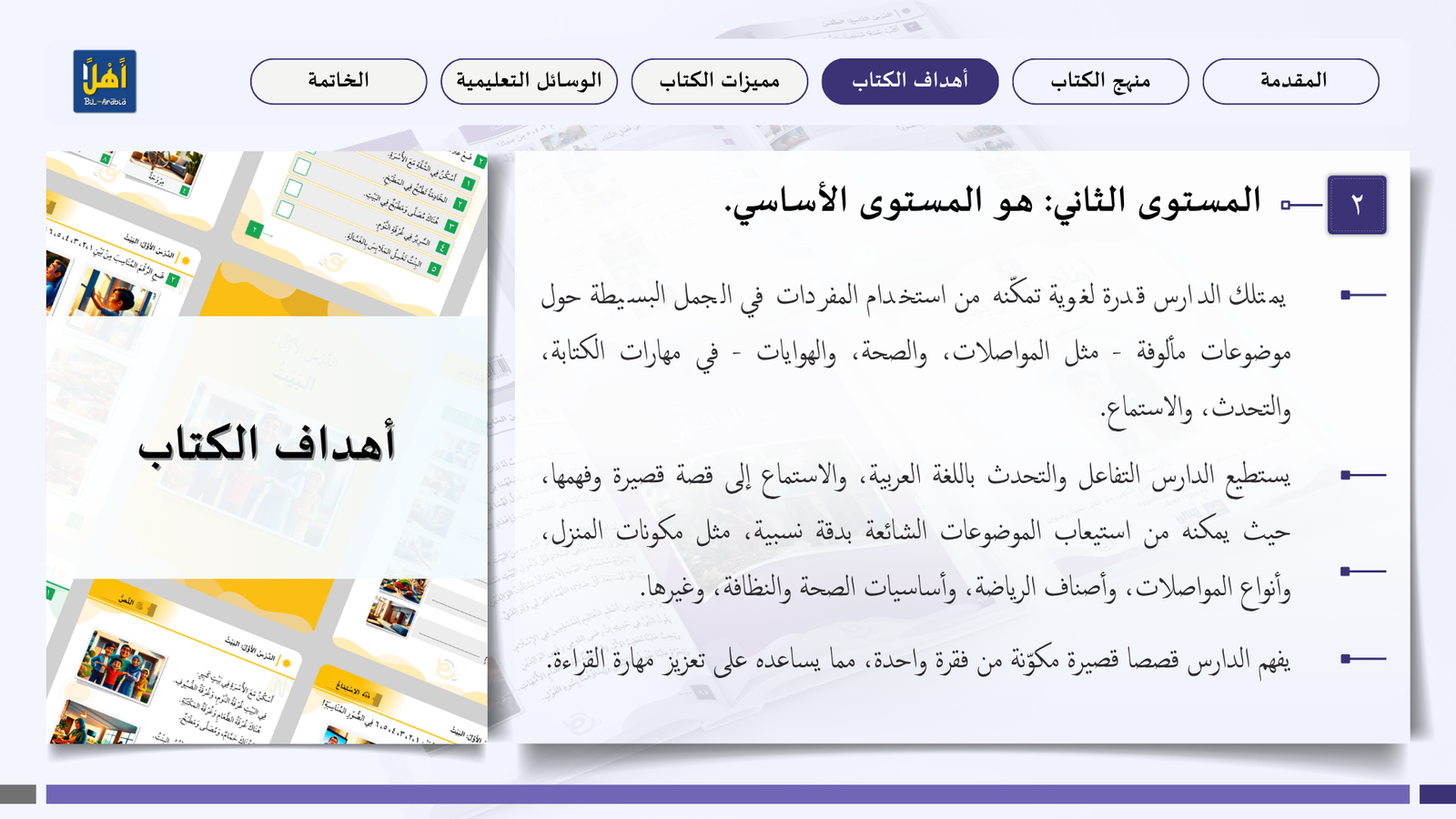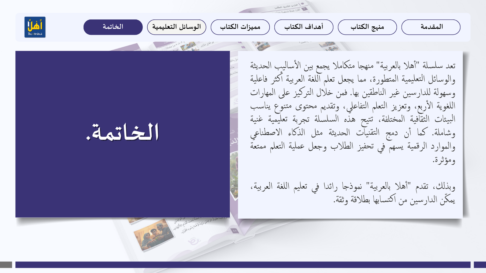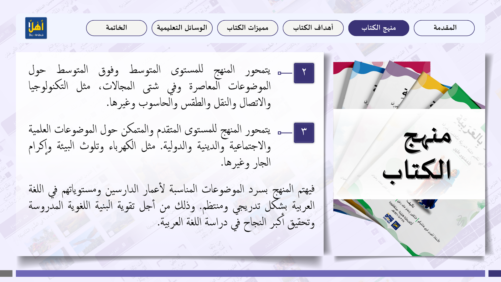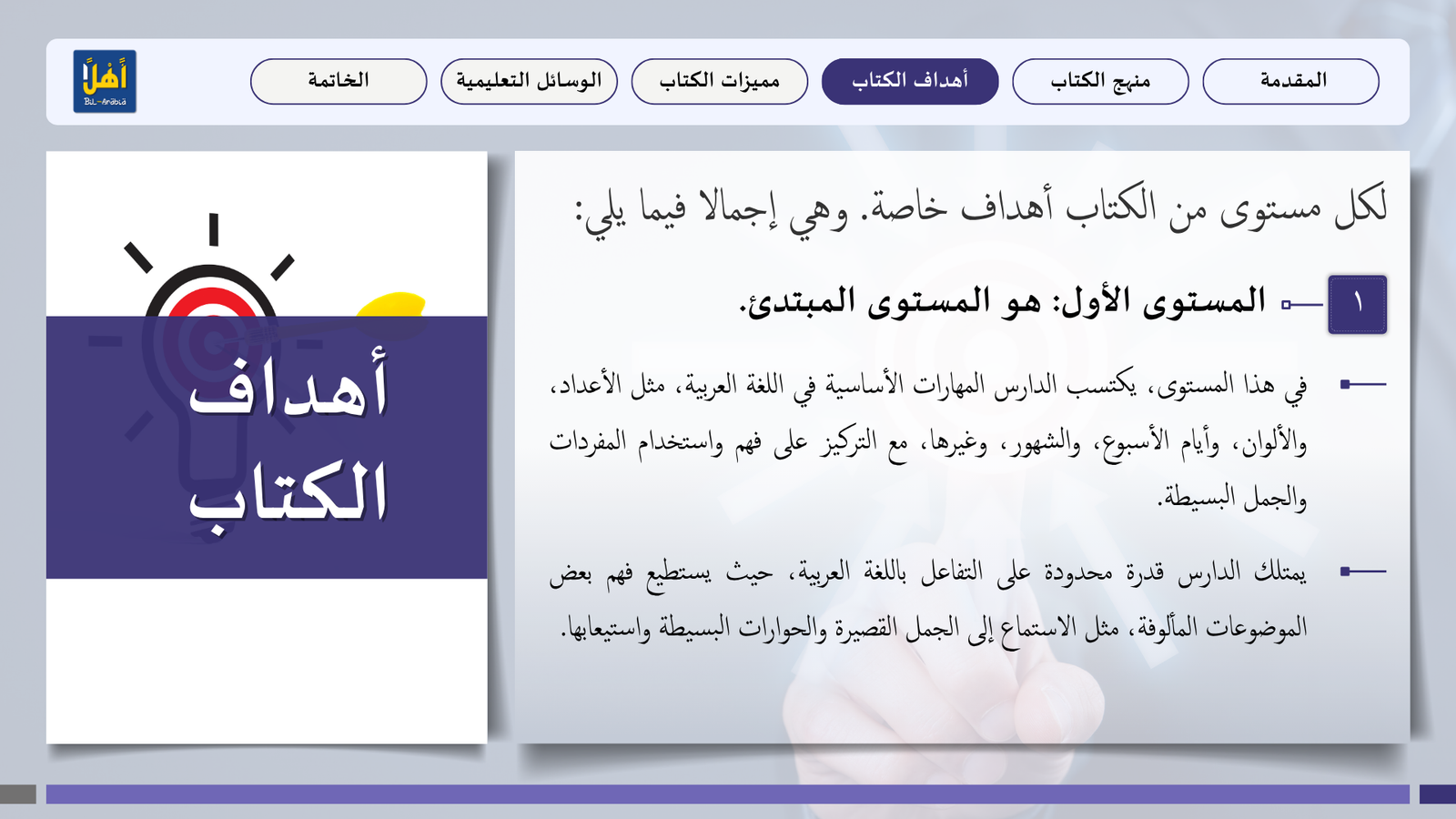 التعريف بمنهج سلسلة ” أهلا بالعربية”، وأهدافا، ومميزاتها، ووسائلها التعليمية مفصلا