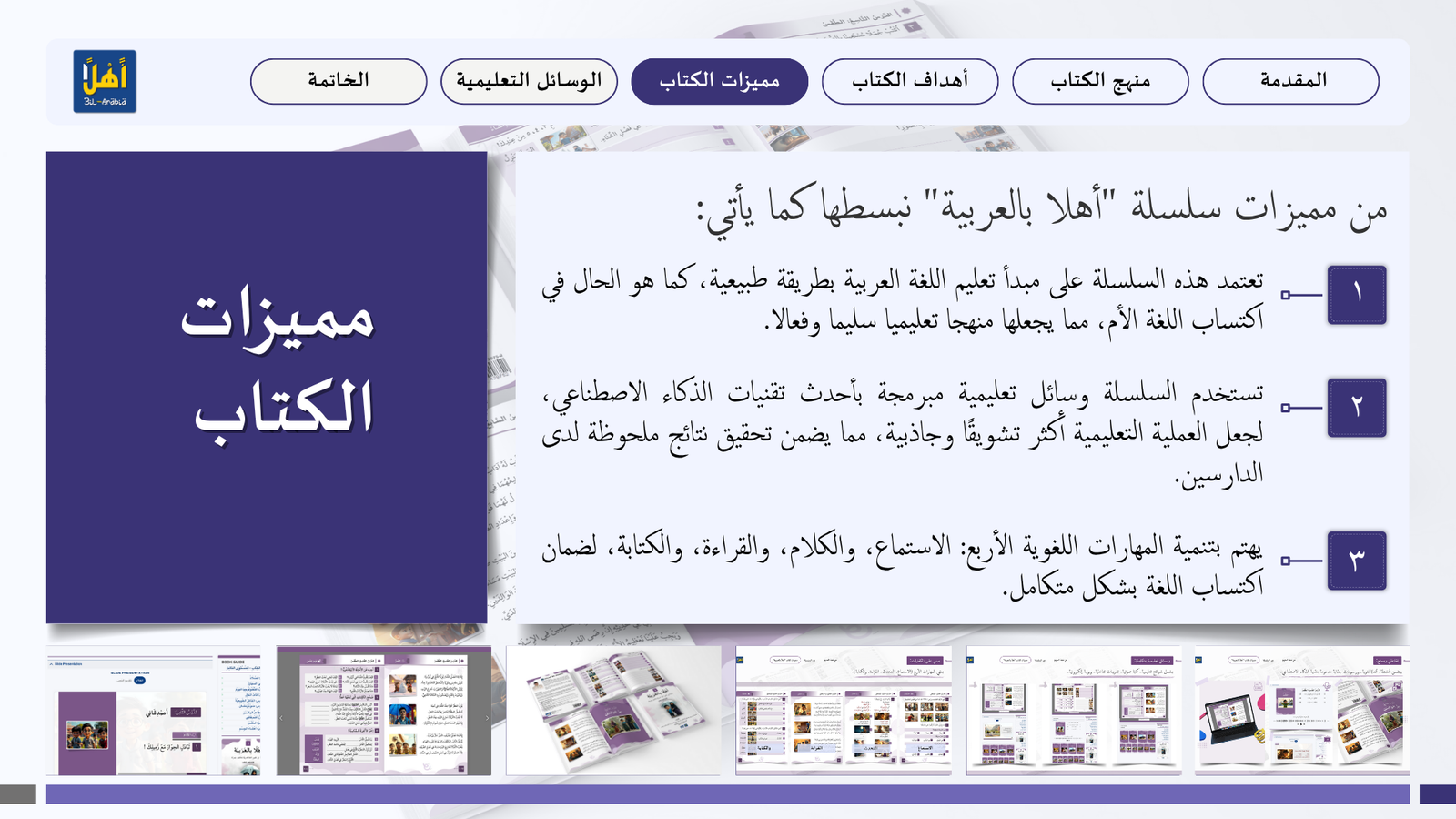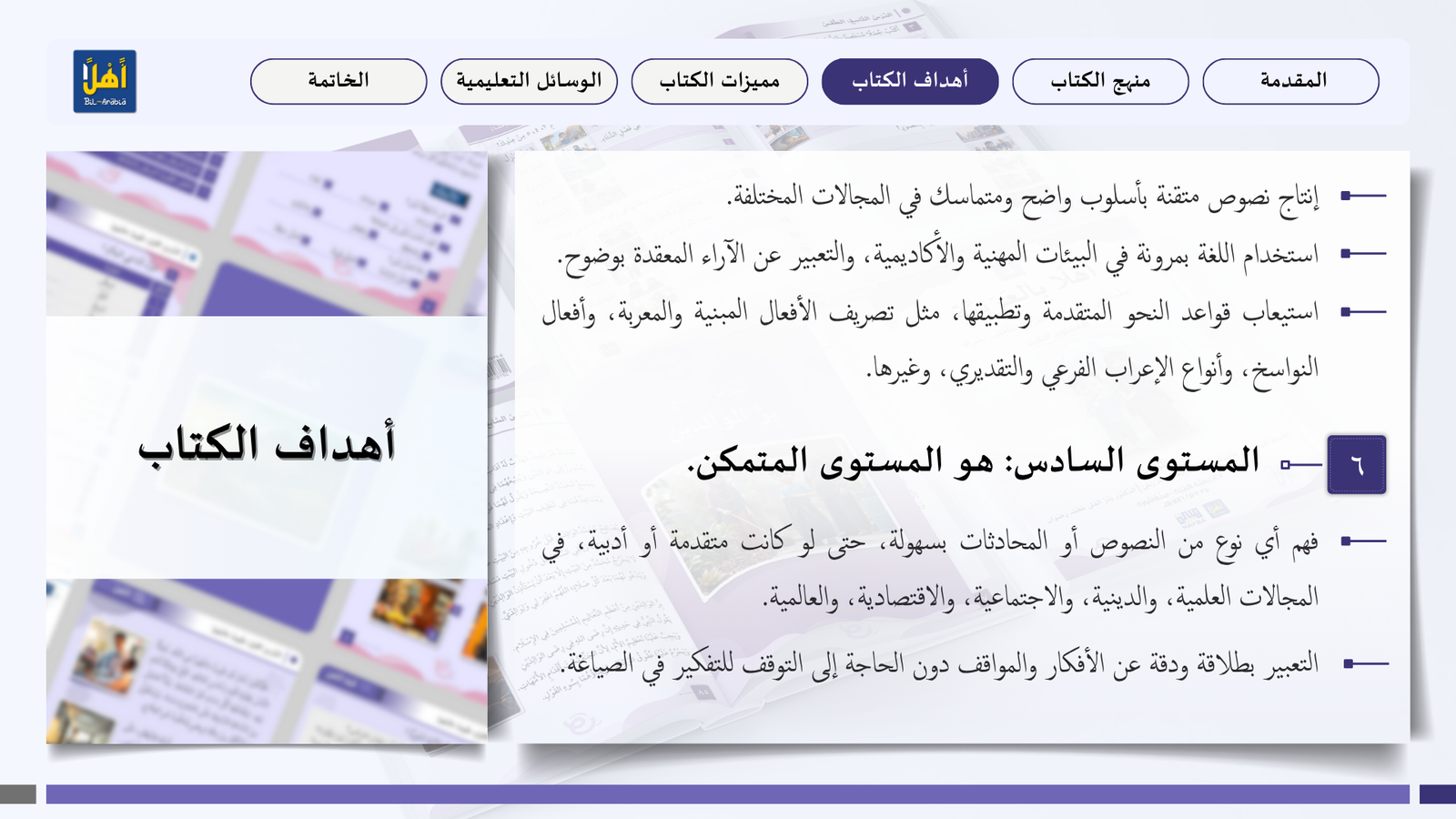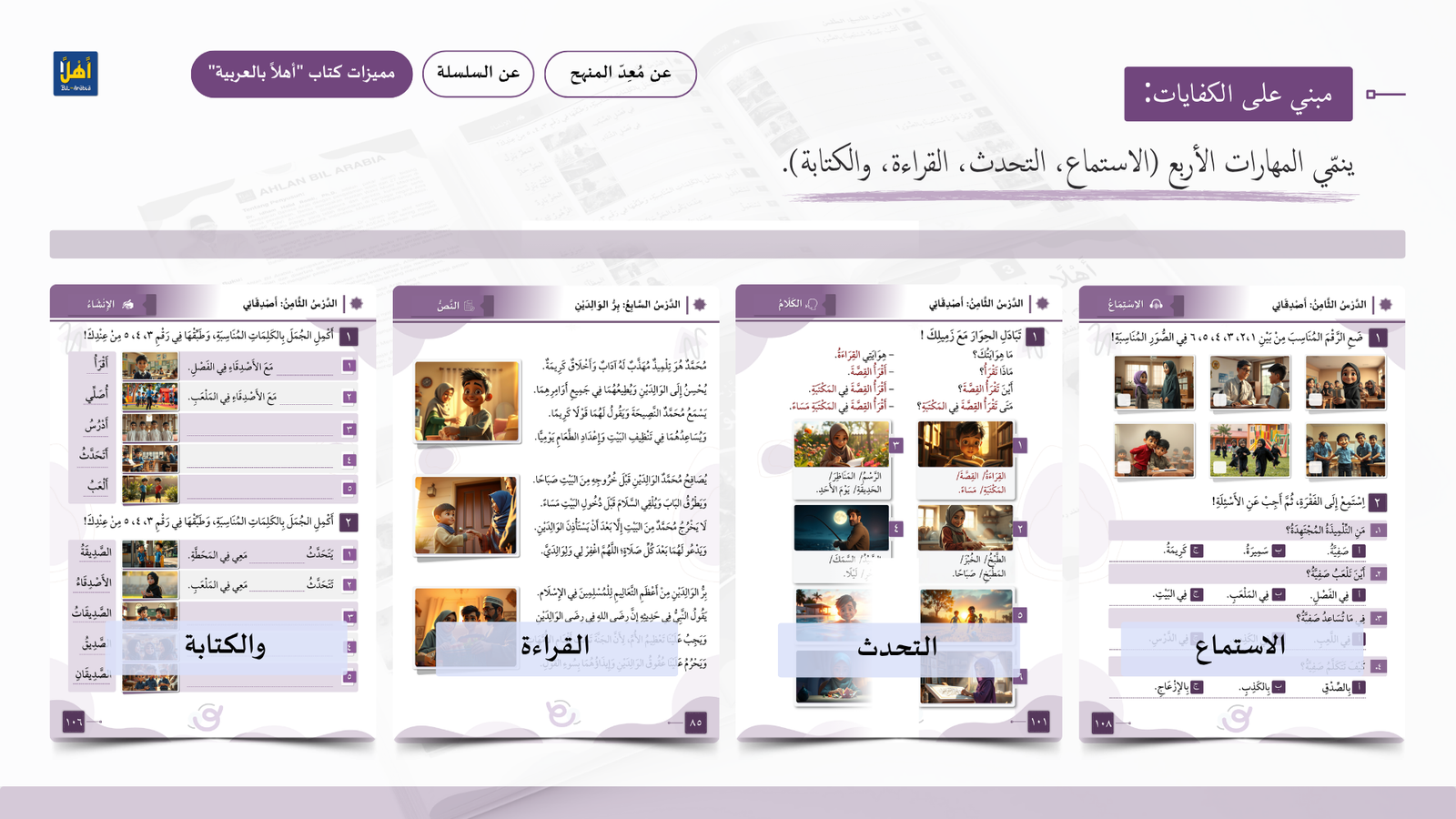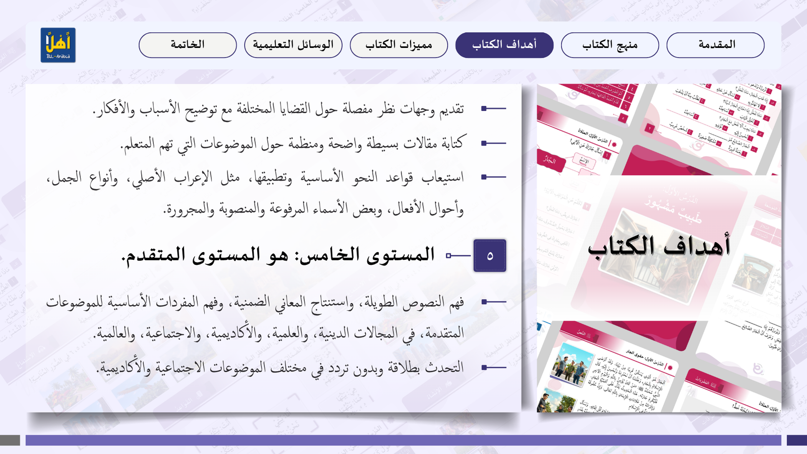 التعريف بمنهج سلسلة ” أهلا بالعربية”، وأهدافا، ومميزاتها، ووسائلها التعليمية مفصلا